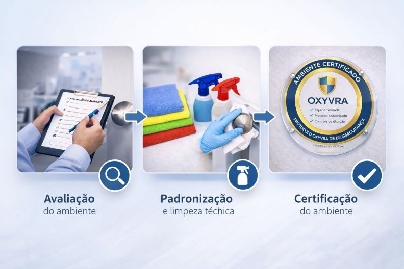 4) Cerificação do ambiente: após a implantação do protocolo, o ambiente recebe a certificação Oxyvra, demonstrando o compromisso com padrões elevados de biossegurança.